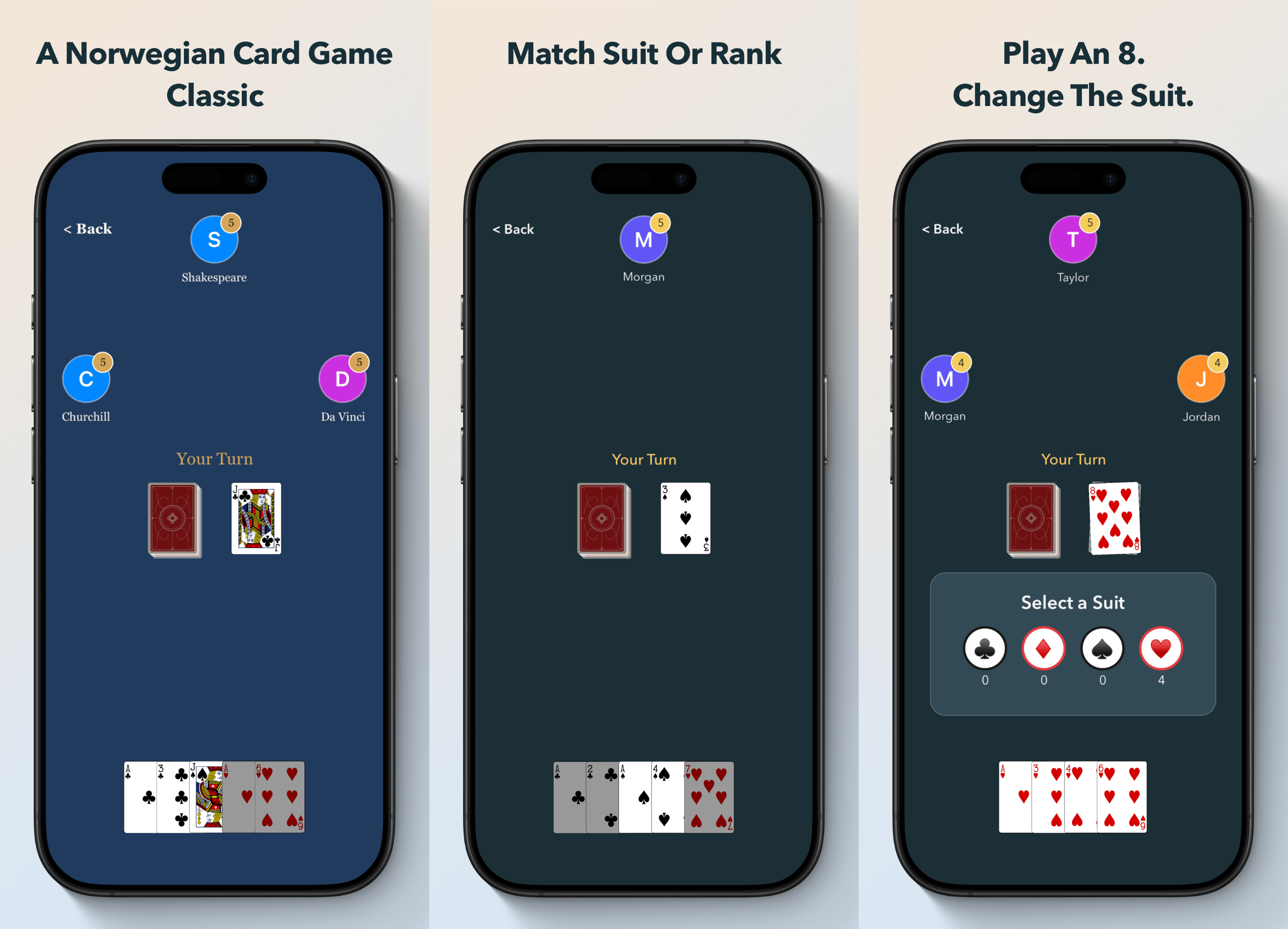 It’s a Norwegian card game in the crazy eights family. Match the suit or rank on the pile, play an 8 to change suit, and be the first to empty your hand. Simple rules, quick rounds, and that “just one more game” pull.